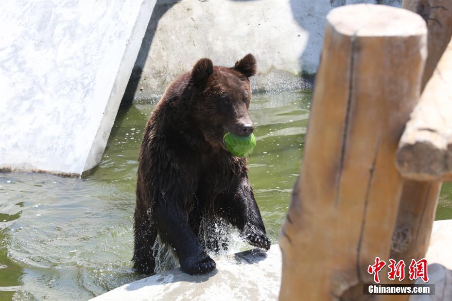 8月3日,哈尔滨北方森林动物园的棕熊在抢食西瓜。据了解,夏季动物们胃口变差,食欲大减。为了保证动物的健康,天气炎热时,饲养员会对动物的“菜单”进行调整。所以在哈尔滨北方森林动物园夏季会给草食和杂食动物们准备充足的西瓜。中新社记者 于琨 摄