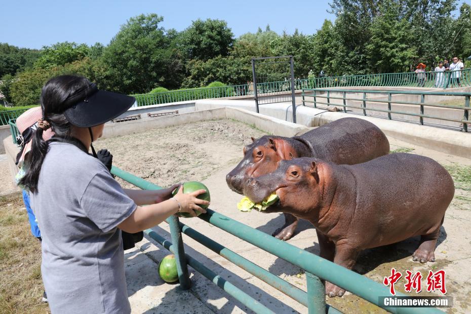 8月3日,哈尔滨北方森林动物园的河马在抢食西瓜。据了解,夏季动物们胃口变差,食欲大减。为了保证动物的健康,天气炎热时,饲养员会对动物的“菜单”进行调整。所以在哈尔滨北方森林动物园夏季会给草食和杂食动物们准备充足的西瓜。中新社记者 于琨 摄