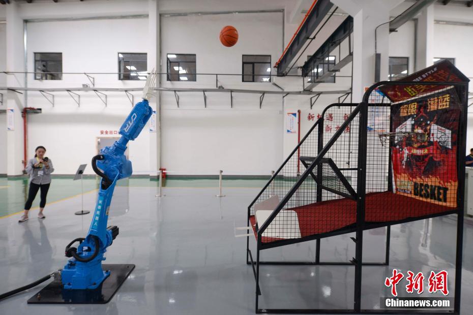 8月3日,一架机器人正在演示投篮技巧。该机器人由长泰机器人研制,兼具高速度与高精度双重优点及灵活的机械手腕,是一款低成本高性能的六轴轻型机器人,重复定位精度可达0.05毫米。中新社记者 杨华峰 摄