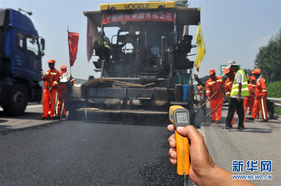 在位于河北省承德市的承朝高速公路项目工地,温度计显示沥青混合料摊铺后的初压温度达159.8摄氏度(8月3日摄)。 新华社记者 赵宇思 摄