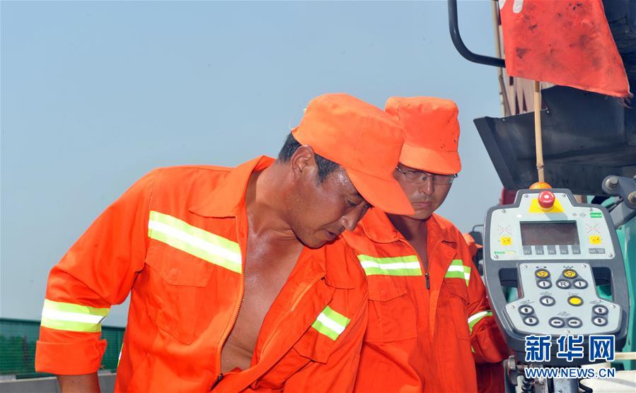 在位于河北省承德市的承朝高速公路项目工地,养护工人顶着烈日工作(8月3日摄)。新华社记者 赵宇思 摄