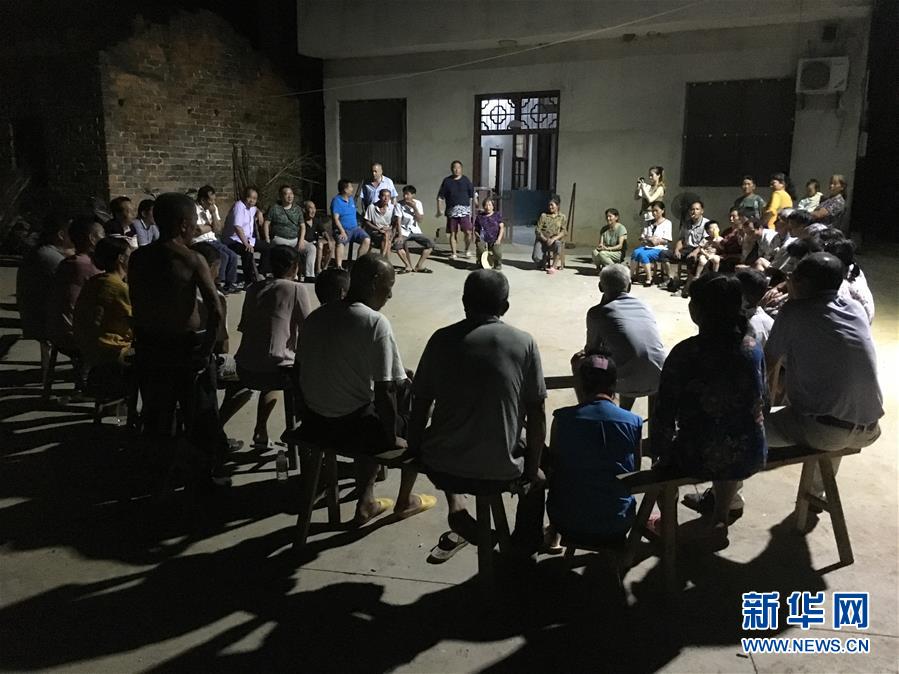 崇阳县铜钟乡的部分村民在参加“湾子夜话”(7月26日手机拍摄)。夜幕低垂,从连绵山岭间吹来的风,给夏夜添了几分凉意。位于幕阜山区湖北崇阳县铜钟乡的坳上村里,村民们结束了一天的忙碌,来到党员群众服务中心前的小广场,与县、乡干部以及驻村扶贫工作队队员们围坐在一起,参加精准扶贫“湾子夜话”。新华社记者 梁建强 摄