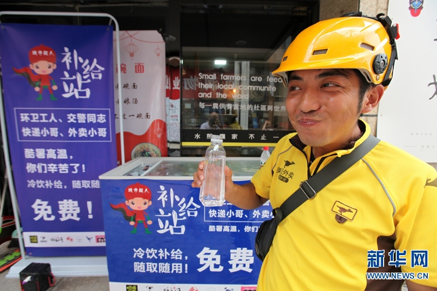 2018年8月5日,河南许昌,一名外卖员工取用“爱心冰柜”内的饮料。