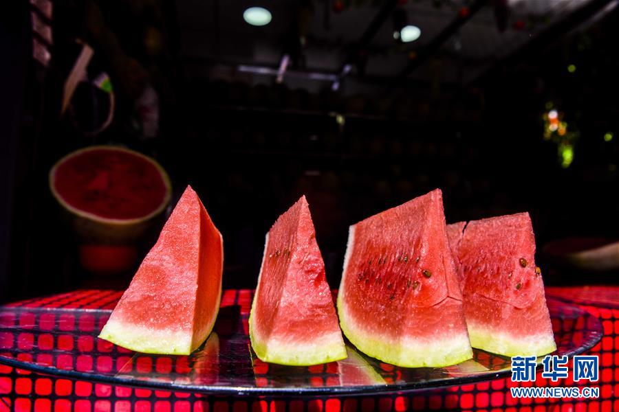 在乌鲁木齐新疆国际大巴扎内,切好的西瓜等待游客品尝(8月9日摄)。 新华社记者赵戈摄
