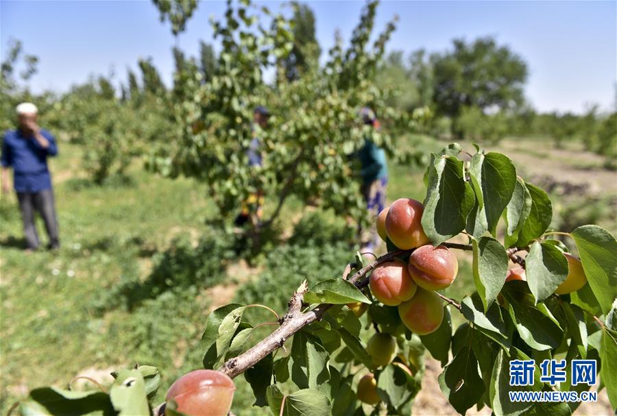 新疆托克逊县夏乡工尚村的果农在杏园内采摘鲜杏(2017年5月13日摄)。 新华社记者胡虎虎摄