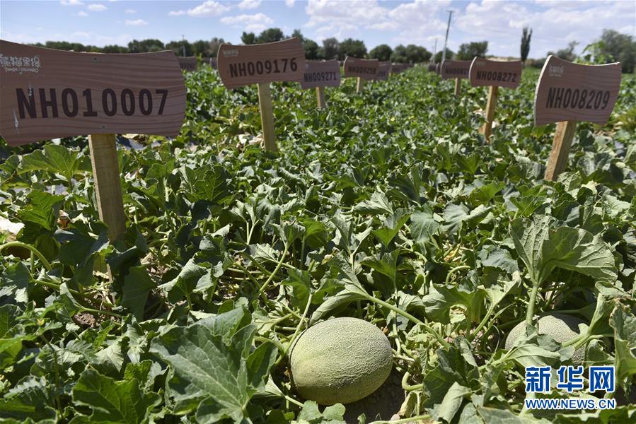 新疆哈密市伊州区南湖乡精品种植园里的哈密瓜都有各自的“身份证”,通过对应的编号即可追溯查证(2017年7月2日摄)。 新华社记者胡虎虎摄