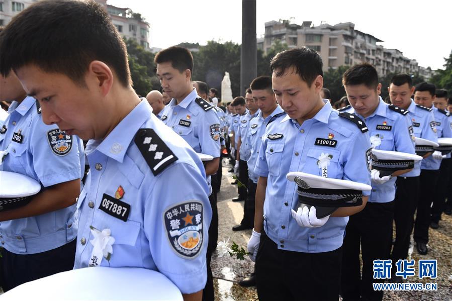 8月10日,在四川仁寿县,民警脱帽送别战友。 新华社发