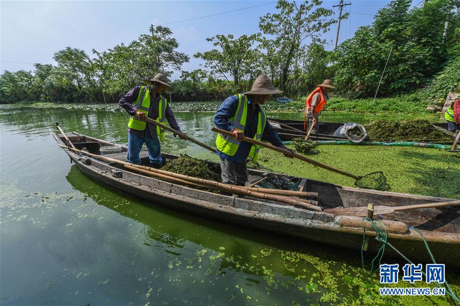 8月11日,工作人员在东升村杨下港河道中清理浮萍和杂草。新华社记者 徐昱 摄