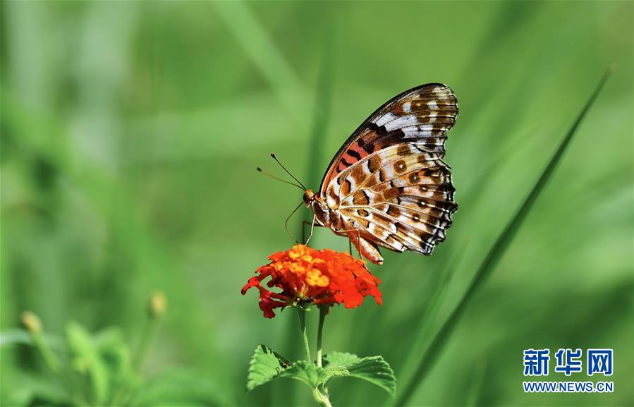 福建省福州市温泉公园内,一只蝴蝶停歇在马缨丹花枝头上采蜜(8月11日摄)。 夏末秋初,福建省福州市温泉公园内的马缨丹花大面积开放,吸引成群的蝴蝶前来采蜜。 新华社记者梅永存摄