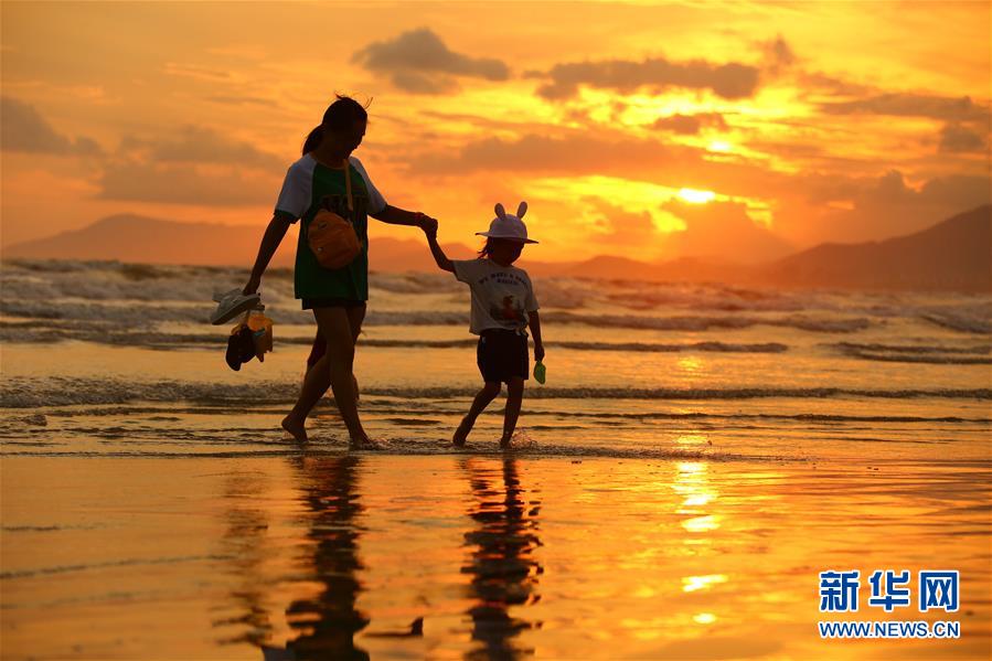 8月12日,晚霞如画,人们在海南省三亚市三亚湾海边游玩。 新华社发(陈文武 摄)