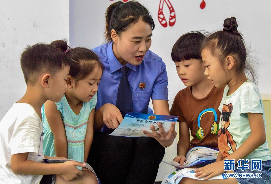 8月13日,河北省阜城县人民检察院检察官为小朋友们讲解安全防范知识。