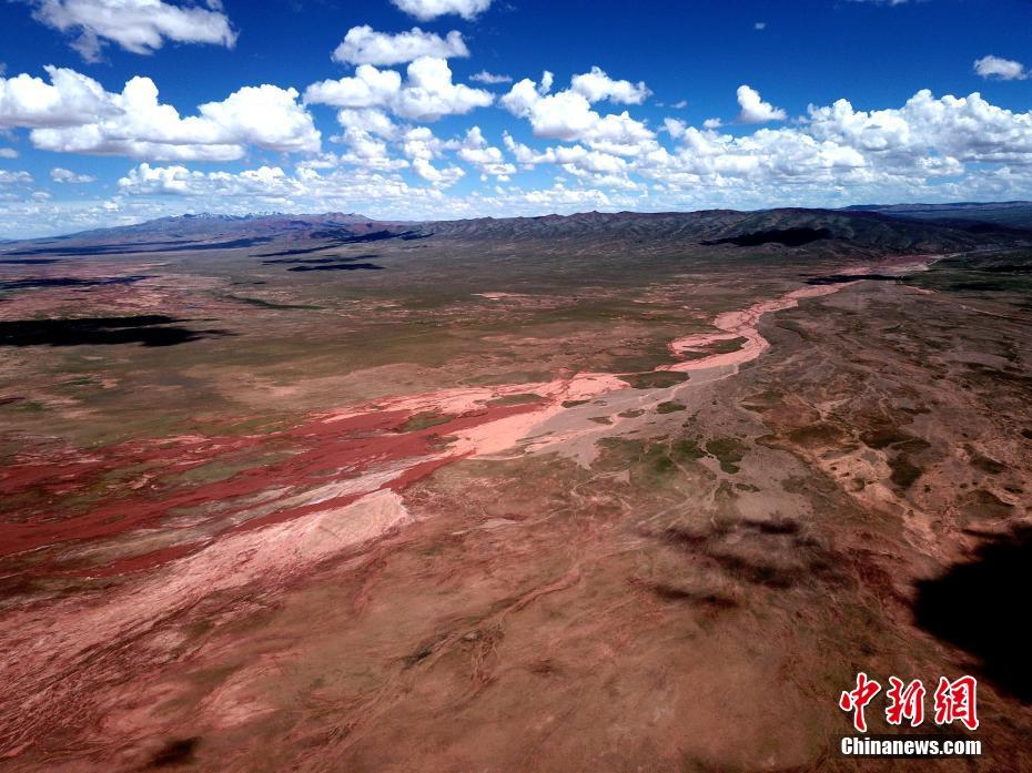由山间冰雪融水汇聚而成的河道阡陌纵横,浑然天成;波澜壮阔的阿拉克湖碧空如洗,奔流不息地拍打着红色河床,犹如碧玉宝镜舞动着红色丝带,蜿蜒曲折数百公里,着实巍巍壮观。图为俯瞰阿拉克湖。 苏巧将 摄
