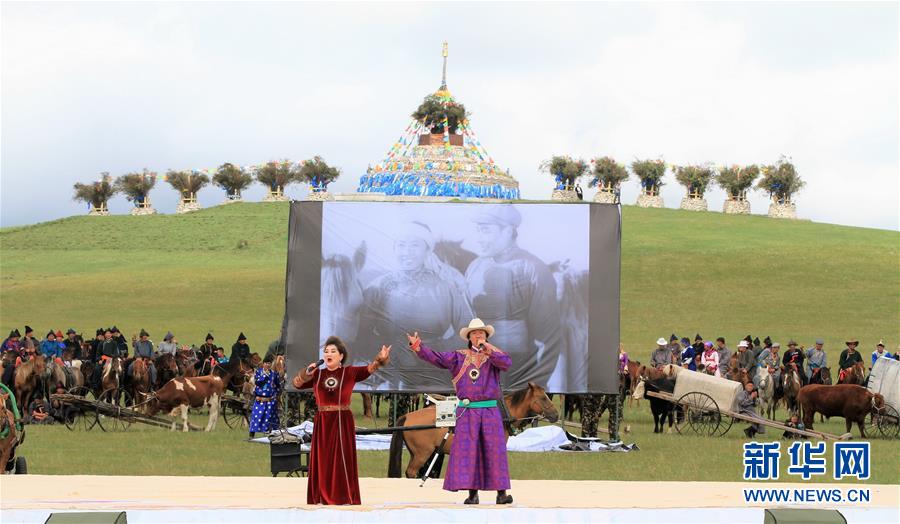 8月12日,蒙古族歌手布仁巴雅尔(右)与鄂温克族歌手乌日娜在庆祝大会上演唱。
