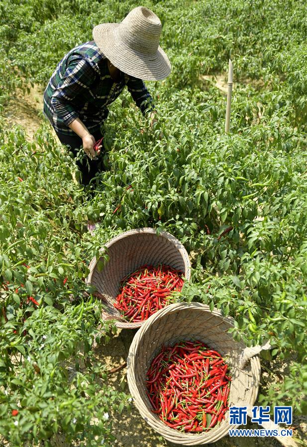 8月13日,湖北省宣恩县沙道沟镇四道水村的农民在采摘辣椒。