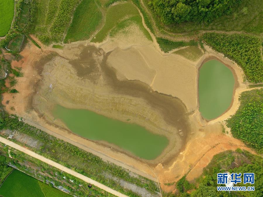 这是8月13日拍摄的湖南省湘乡市龙洞镇几近干涸的石头水库(无人机拍摄)。记者从湖南省防汛抗旱指挥部办公室了解到,截至13日,湖南省已有201万亩农作物受旱,因旱出现饮水困难的群众达2.5万人。新华社发(薛宇舸 摄)