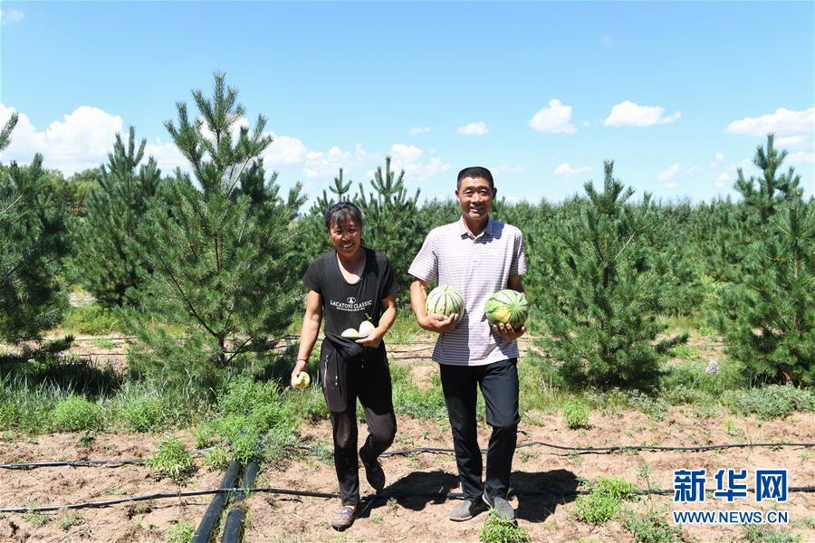 马云平和妻子王长荣在沙地里采摘水果(8月10日摄)。