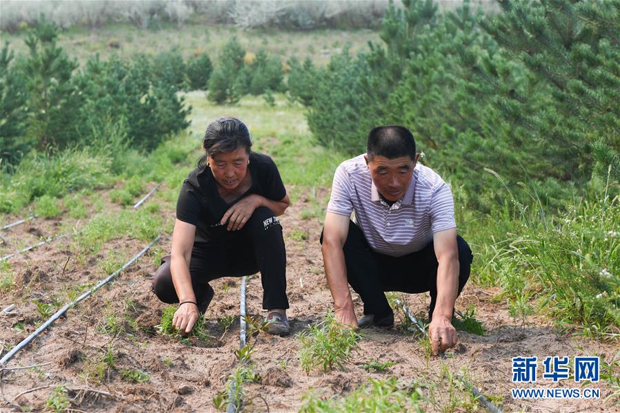马云平和妻子王长荣在中草药地里除草(8月10日摄)。