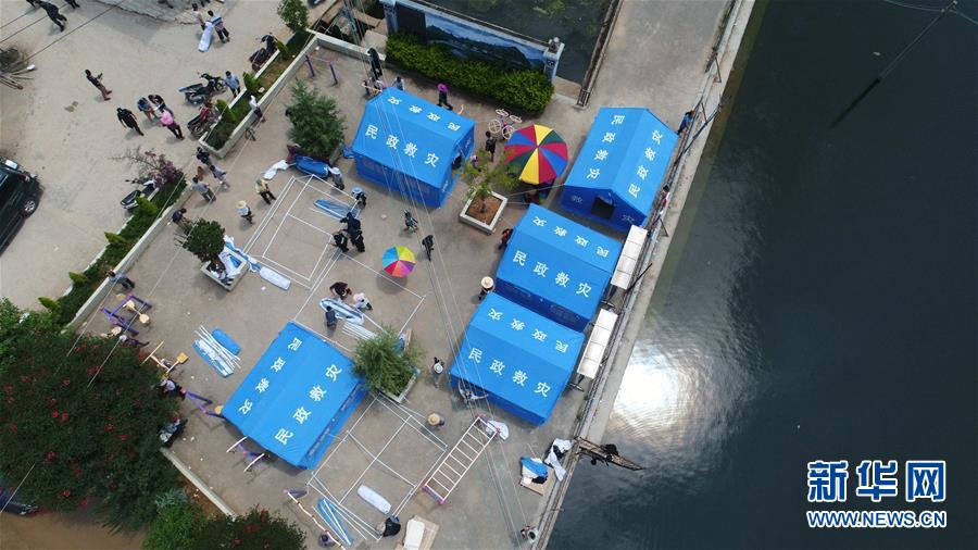 通海县四街镇中搭起的救灾帐篷(8月13日无人机拍摄)。