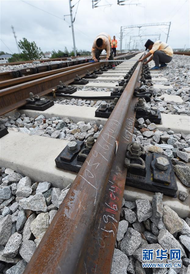 8月13日,在青盐铁路连盐段建设现场,工人在进行道岔间距测量并标记数据。 新华社记者 孙参 摄