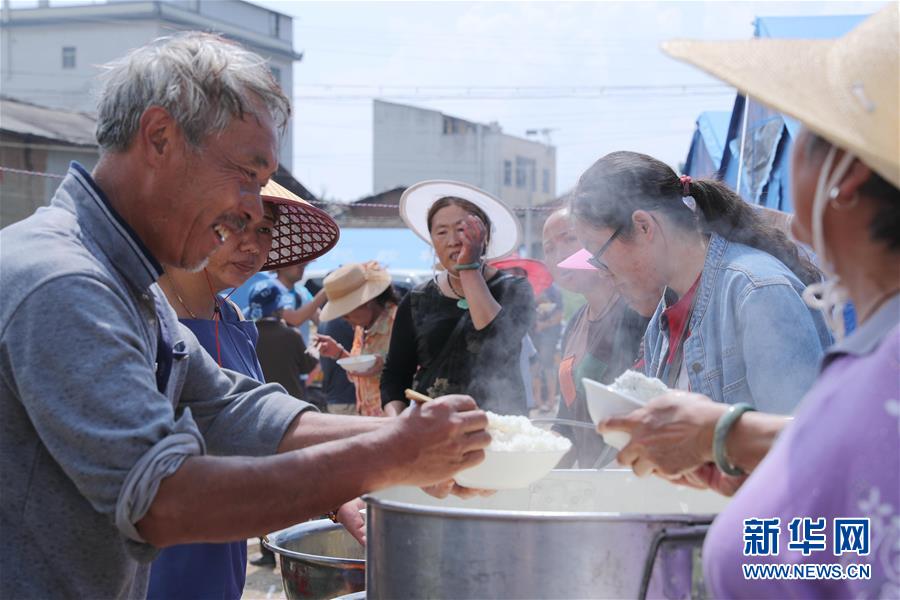 8月14日,在通海县四街镇者湾村的村民安置点,受灾群众准备吃中午饭。