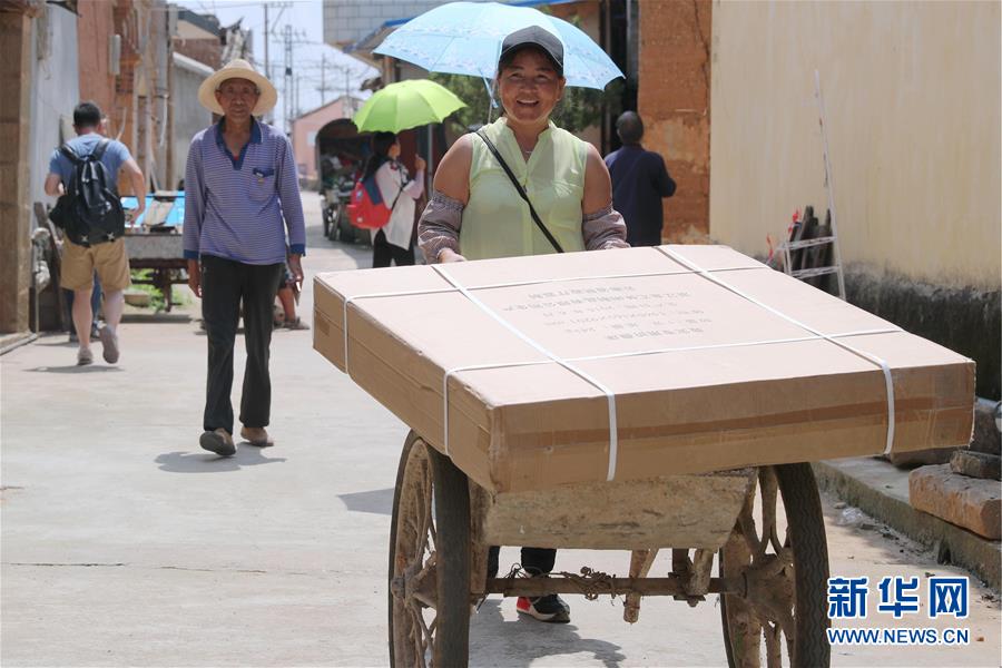 8月14日,在通海县四街镇者湾村的村民安置点,村民在搬运救灾物资。