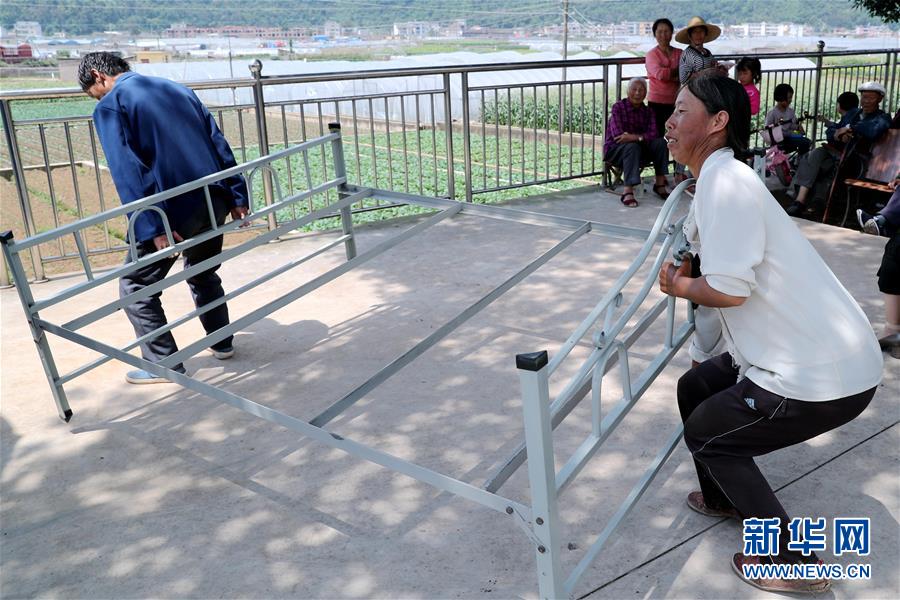 8月14日,在通海县四街镇者湾村的村民安置点,村民在搬运床架。