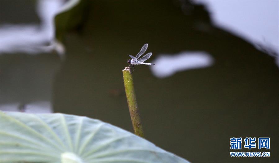 8月14日,在扬州市蜀冈-瘦西湖风景名胜区的荷塘中,一只蜻蜓在休憩。“末伏”将至,江苏省扬州市蜀冈-瘦西湖风景名胜区的荷塘内荷花绽放,娇艳夺目,吸引市民和游客前来观赏。 新华社发(孟德龙 摄)