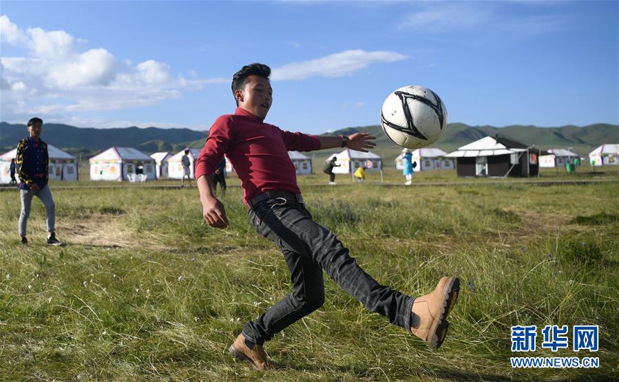 在甘南藏族自治州碌曲县尕海镇尕秀村帐篷城度假区,牧民在草原上踢球(8月10日摄)。新华社记者 陈斌 摄