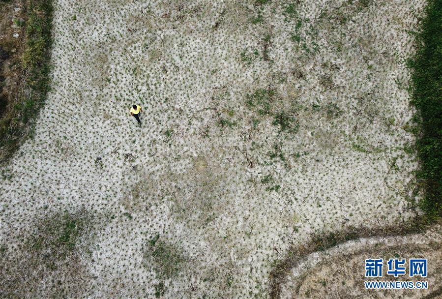 8月14日,在江西省金溪县琉璃乡印山村,一名村民在查看干涸的稻田(无人机拍摄)。受连日高温少雨天气影响,江西省江河湖泊持续低水位,水库蓄水不足,部分地区旱情持续。新华社记者 万象 摄
