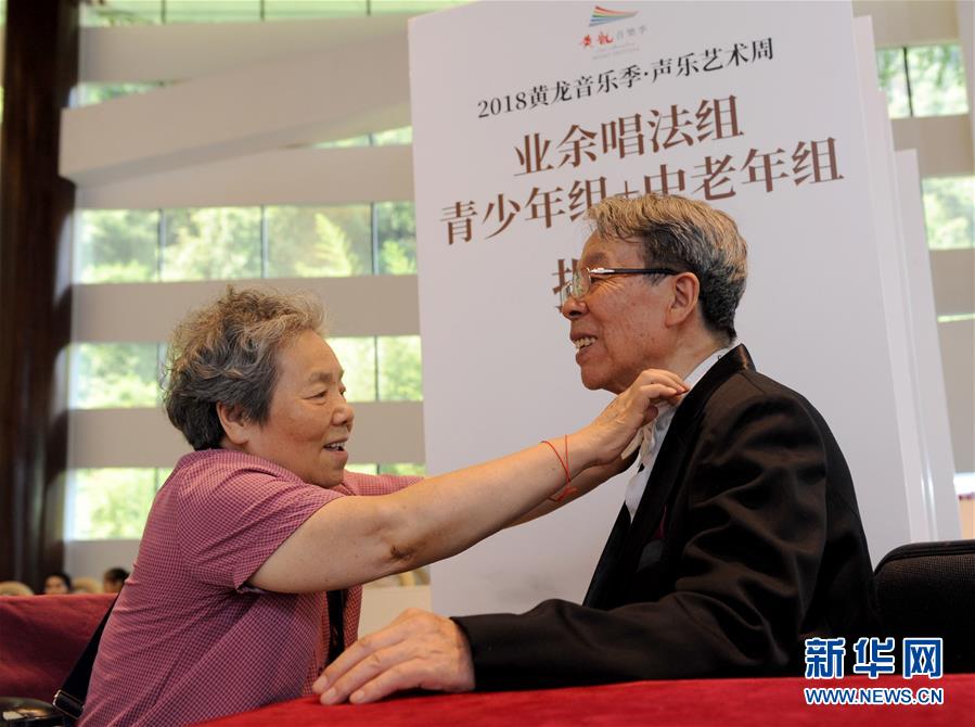 8月14日,孙怡青(左)在比赛间隙为刘兴仁整理着装。