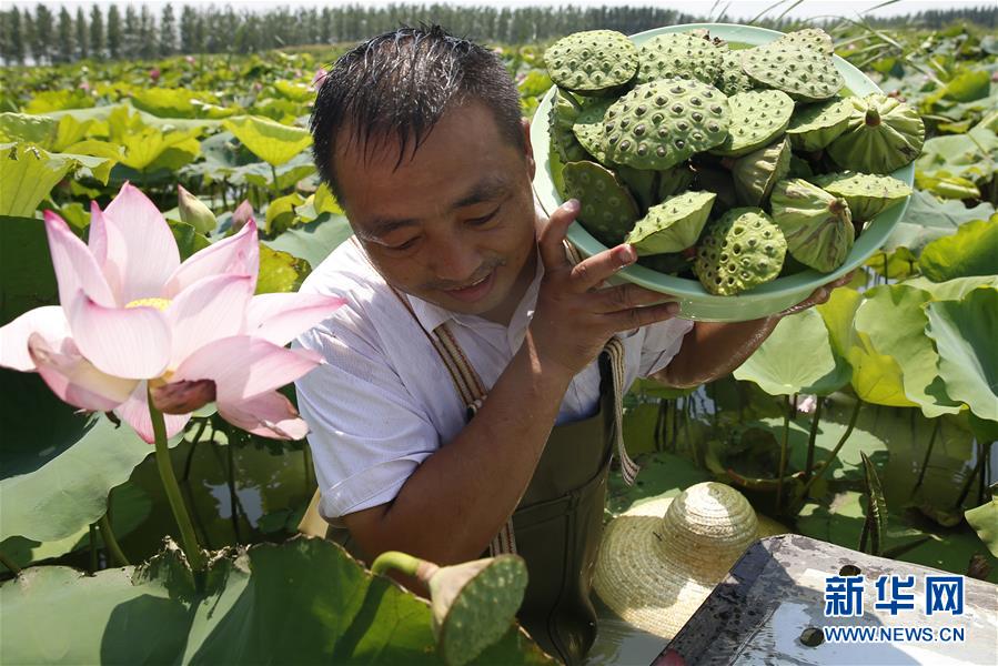8月14日,江苏省泗洪县龙集镇孙庄村农民在水面采摘莲蓬。