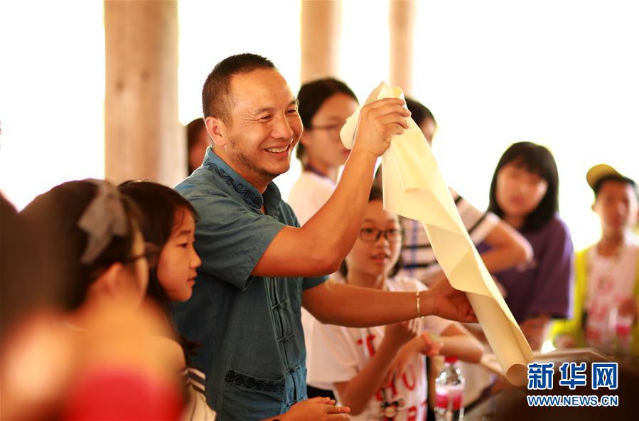8月14日,在贵州省黔东南苗族侗族自治州丹寨县南皋乡石桥村“纸会唱歌”古法造纸研学基地,潘玉华向学生讲解古法造纸的历史。新华社发(黄晓海 摄)