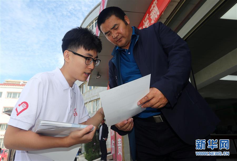 8月14日,天津医科大学的大学生志愿者梁云恺(左)向市民讲授保健知识。 新华社发(刘东岳 摄)