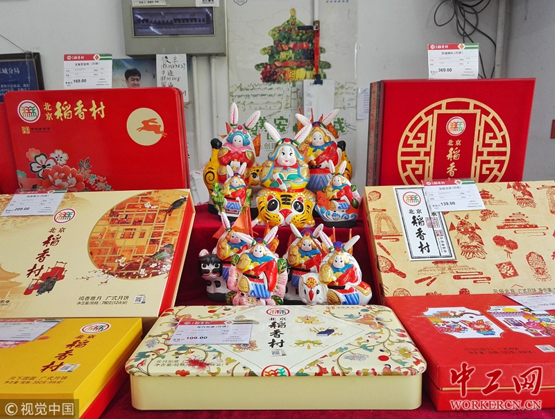 2018年8月15日,北京,稻香村创新口味月饼上市, 在北京稻香村各大门店里,憨态可掬的兔儿爷和口味丰富的月饼已摆上柜台,经典口味月饼之外,新增橘香茉莉、清香蜜桃等创新口味。(图片来源视觉中国)