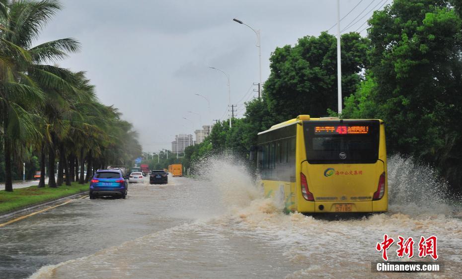 汽车在海口琼山大道积水路段行驶。 吴天军 摄