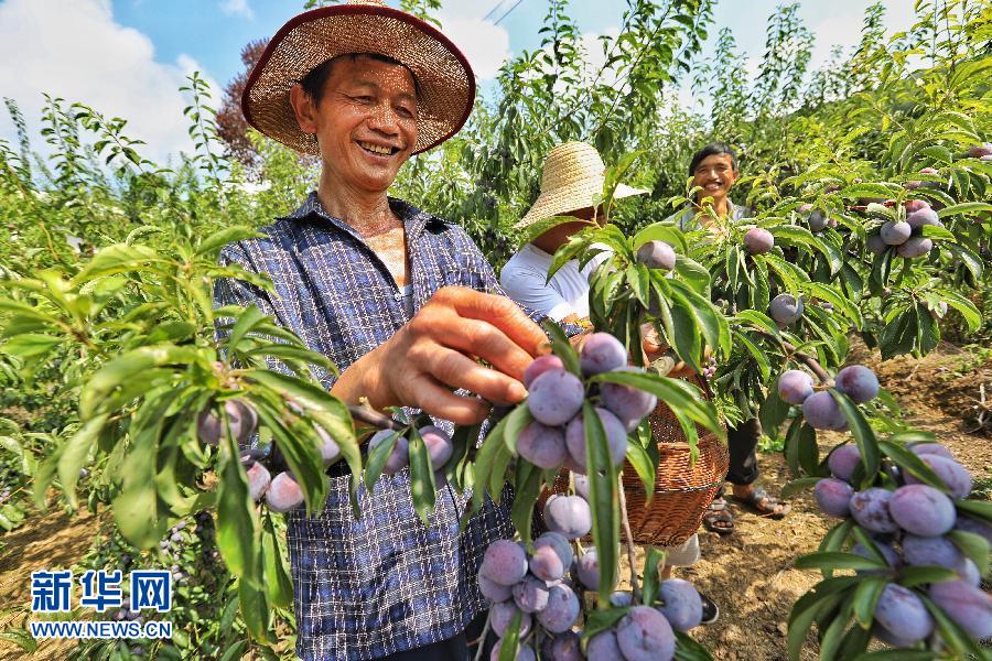 8月12日,平正乡红心村的几名果农在采摘李子。近日,贵州省遵义市播州区平正乡的一万多亩脆红李丰收,果农们抢抓农时采摘、分拣李子。新华社记者 刘续 摄