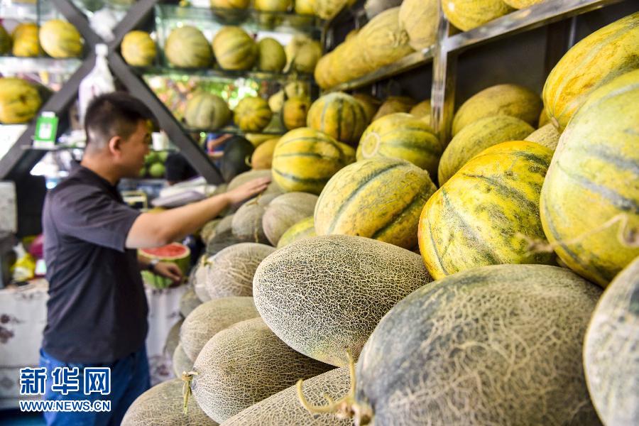 乌鲁木齐新疆国际大巴扎内,游客在挑选甜瓜(8月9日摄)。特殊的地理位置和气候环境,孕育了天山南北香甜多汁的美味瓜果。夏秋之交,正是新疆各类瓜果迎来成熟的时节,“吐鲁番的葡萄,哈密的瓜,库尔勒的香梨人人夸……”这些瓜果将陆陆续续从藤蔓树杈上走进百姓家中,给人们带来甜蜜的享受。新华社记者赵戈 摄