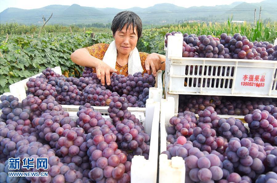 8月7日,山东省淄博市沂源县东里镇香磨村农民在分拣收获的葡萄。立秋时节,山东省沂源县种植的早熟果品、早秋蔬菜等作物开始收获上市,当地农民在多彩田野里收获着各类作物,开启早秋收获季。新华社发(赵东山 摄)