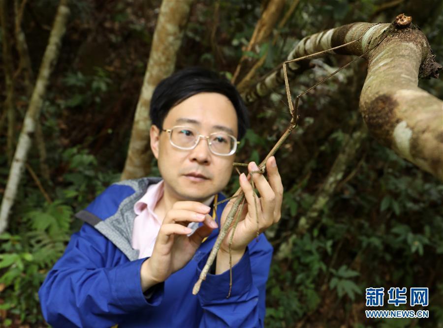 7月31日,成都华希昆虫博物馆馆长、昆虫学家赵力在广西大瑶山国家级自然保护区内查看发现的野生中国巨竹节虫。 新华社发 图片来源:新华网