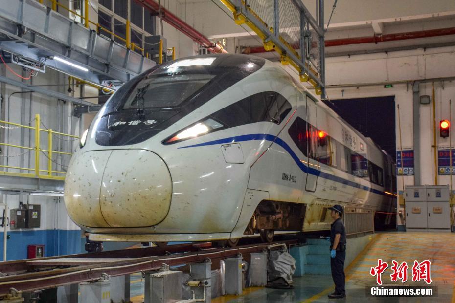 8月15日,受台风“贝碧嘉”影响,海南环岛高铁停运,动车组提早回“港”——中国铁路广州局集团公司广州动车段三亚动车运用所避风,接受检修、清洁。图为动车组入库进行检修。李军 摄