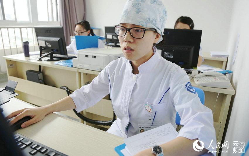 8月10日上午8点左右,交班前,梁倩开始认真核对病人的数据,准备交班工作。(人民网 虎遵会 摄)