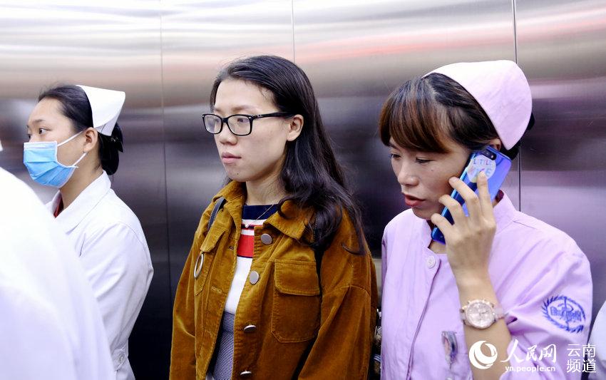 梁倩(左二)正在乘坐电梯离开产科。(人民网 虎遵会 摄)