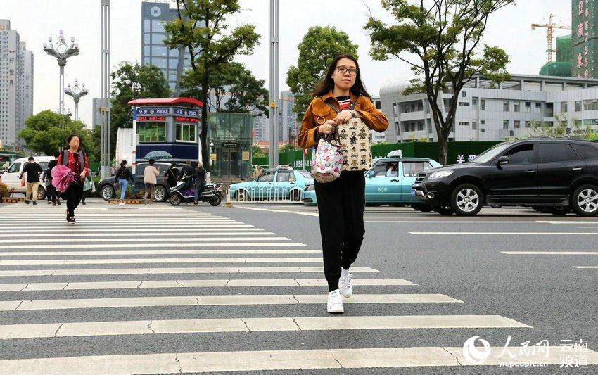 离开医院后,梁倩需要步行5分钟左右才能到需要乘坐的公交站台,图为梁倩正在过斑马线。(人民网 虎遵会 摄)
