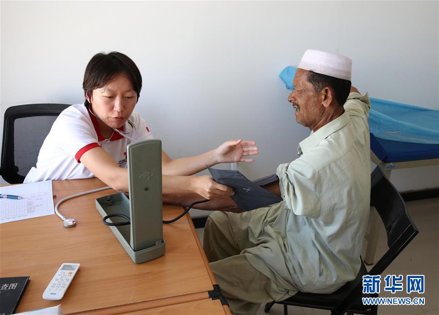 这是2018年3月27日,在巴基斯坦瓜达尔,中国首支援助巴基斯坦医疗队队员为一名当地男子看病。 新华社记者刘天摄