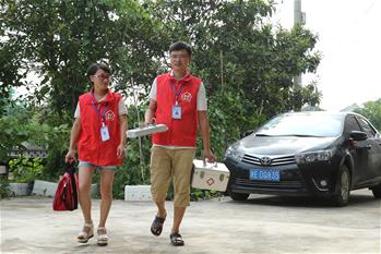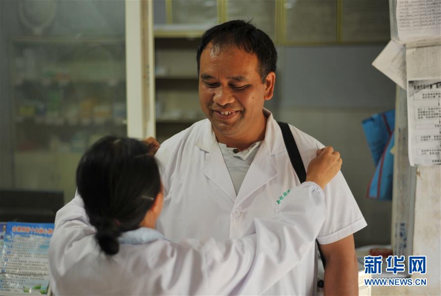 8月16日,在凯里市开怀街道薅支坪村卫生室,崔雪梅(前)为即将外出巡诊的顾银整理服装。