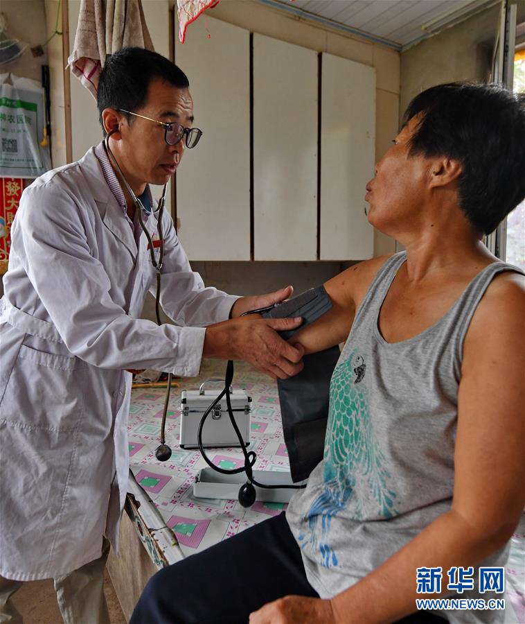 8月16日,陈建新(左)为村民检查身体。 新华社记者 张楠 摄