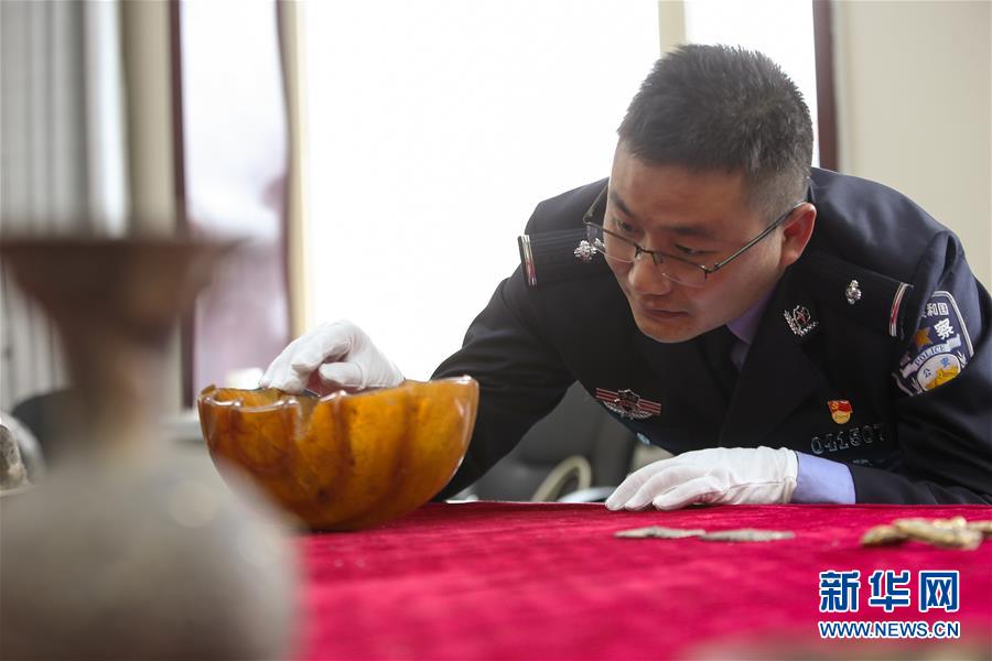 民警在都兰县公安局展示追缴回的文物(8月2日摄)。 按照公安部统一指挥部署,青海省公安机关在河南、山西、浙江、云南等地公安机关全力配合下,近日成功侦破都兰盗掘古文化遗址古墓葬案,抓获涉及实施盗掘、幕后出资、联系销赃、倒卖文物等环节的犯罪嫌疑人26名,追缴被盗掘出土的各类文物646件,实现对文物犯罪的全链条打击,是全国打击文物犯罪专项行动取得的又一重要战果。 新华社发(张铮摄)