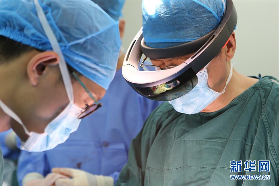 医生佩戴“混合现实”眼镜进行脊柱畸形矫形手术(7月31日摄)。 据西安市红会医院介绍,该院的外科医生日前首次在“混合现实”技术引导下为一名15岁的患者成功实施脊柱畸形矫形手术。该技术将患者的3D全息模型与真实病灶部位进行叠加,如同给医生装上“透视眼”,有效提升其空间感知能力,提高了手术的精准度和安全性。 新华社发