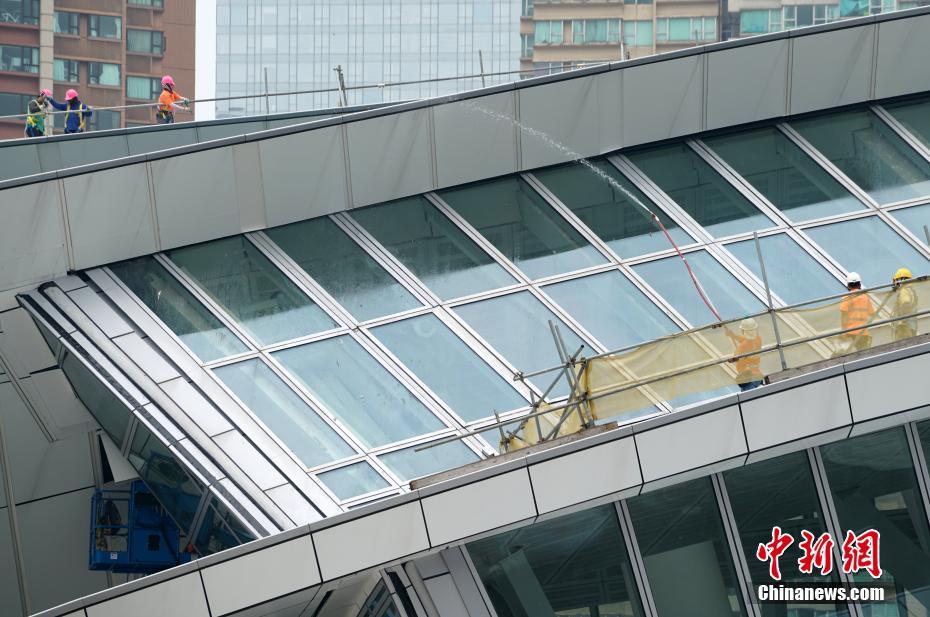 8月24日,广深港高铁香港段西九龙站正在进行收尾工作,工人正在喷水清洗外墙。香港特区政府运输及房屋局23日正式宣布,广深港高速铁路香港段将于9月23日开通,届时会有列车直达内地44个站点。中新社记者 张炜 摄