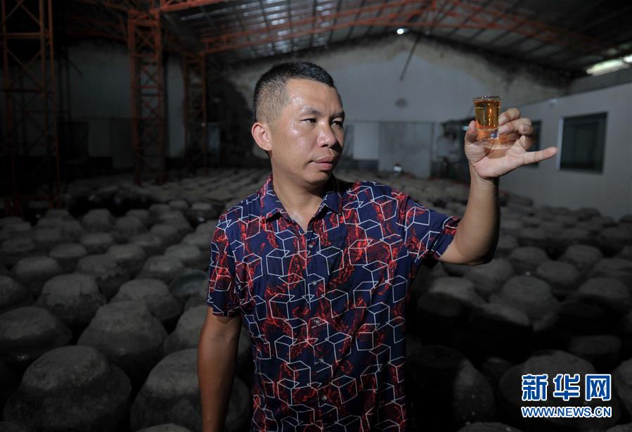 在福建省古田县玉源村,一家红曲生产企业的工人查看用红曲酿造的红曲酒(8月22日摄)。